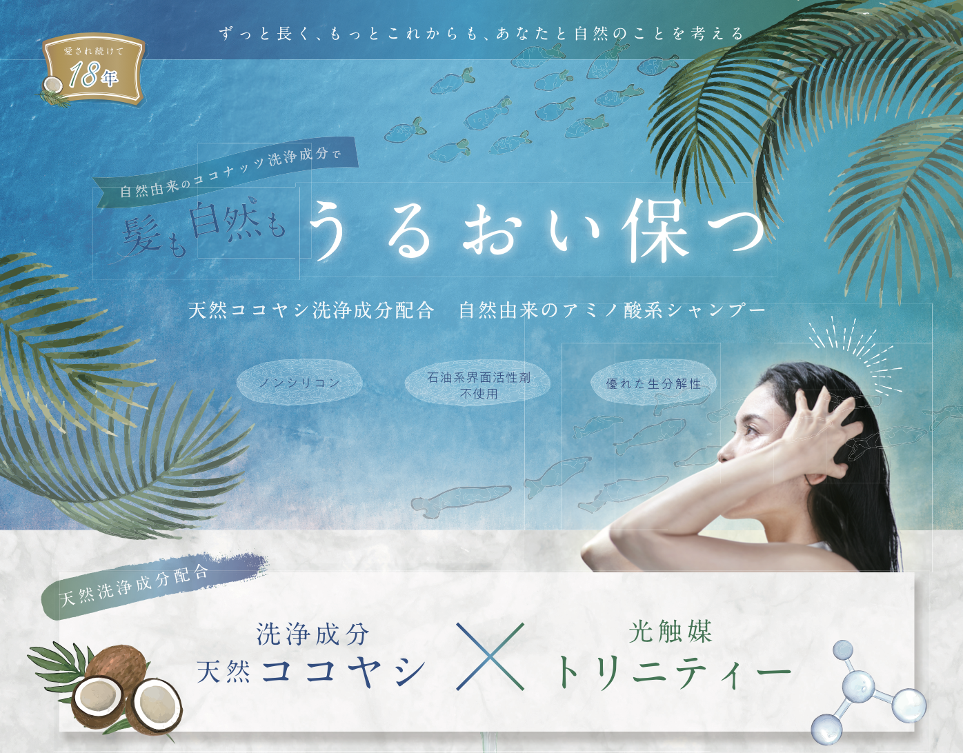 ココヤシ由来の優しい洗浄成分で汚れがしっかり洗い落とせ る仕組みは、トリニティーの超親水性作用のおかげ。 この超親水性作用は、頭皮の皮脂や汚れを吸着し取り除くこと ができます。 さらに抗炎症・抗菌作用があり、刺激から譲りながら適度な保 湿効果を毛髪に与えることができます。