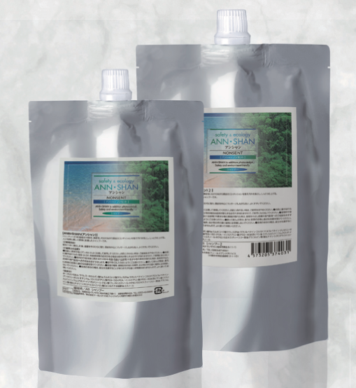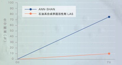 通常石油合成系の界面活性剤は分解率は60%代にとどま るものが多いとされています。アンシャンは、7日で約 80%、2週間で90%近くまで分解されます。 これは生分解性に優れたシャンプー基材にトリニティー の光触媒反応がプラスされているため。 地球環境に限りなく優しい製品として長年愛用されてい ます。