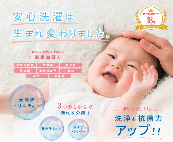 新しくなった安心洗濯にはホタテの貝殻から作られる焼成カルシウムパ ウダーが配合されています。 焼成カルシウムは、水と結びつくことでホタテカルシウムイオンに変身し ます。この水はアルカリ性の力で皮脂などの酸性の汚れを防いでくれるう えに、においの原因である細菌が衣類や洗濯槽につきにくくなります。