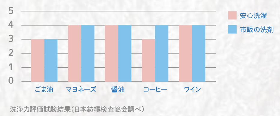 安心洗濯は水と反応すると活性酸素を放出します。こ の活性酸素が、強力に汚れや化学物質を分解します。 この力を利用して、合成洗剤に負けない洗浄力を実現 しています。