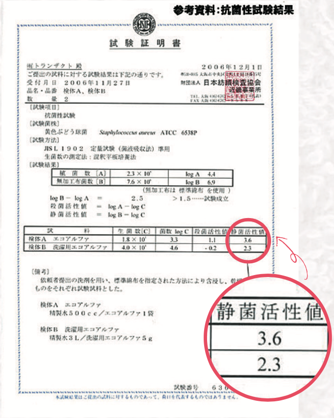 抗菌性試験では、2.0以上の数値で抗菌性があることが認められます 。 安心洗濯はこの抗菌性試験をクリアしており、部屋干しをしても嫌な臭いがつきにくい のは、トリニティーとホタ テパワーの抗菌力のおかげです。